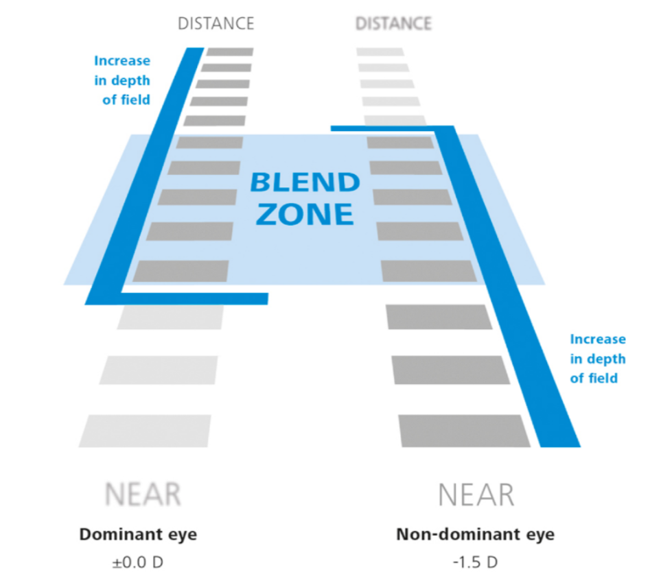 The non-dominant eye is corrected to near vision, and the dominant eye is corrected for distance. This is similar to a traditional treatment called monovision. The difference is that PRESBYOND® incorporates an additional blended zone of vision into each eye, to improve the ability of the brain to adjust to the new visual balance.
